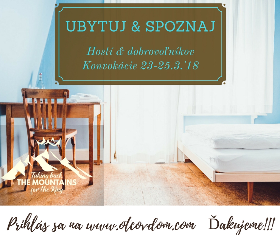 Hľadáme ľudí a rodiny z Bratislavy, ktorí by boli počas Európskej Konvokácie (23.-25.3.2018) ochotní poskytnúť ubytovanie pre našich služobníkov a dobrovoľníkov, ktorí nie sú z Bratislavy. Môžeš ich ubytovať aj na matraci/ nafukovačke alebo ako uznáš za vhodné, všetko pomôže. Je to príležitosť zoznámiť sa, spoznať zaujímavých ľudi a nájsť si nových priateľov. Ak máš možnosť a rád/rada by si pomohla, vyplň tento krátky formulár. Vopred všetkým ďakujeme za pomoc.